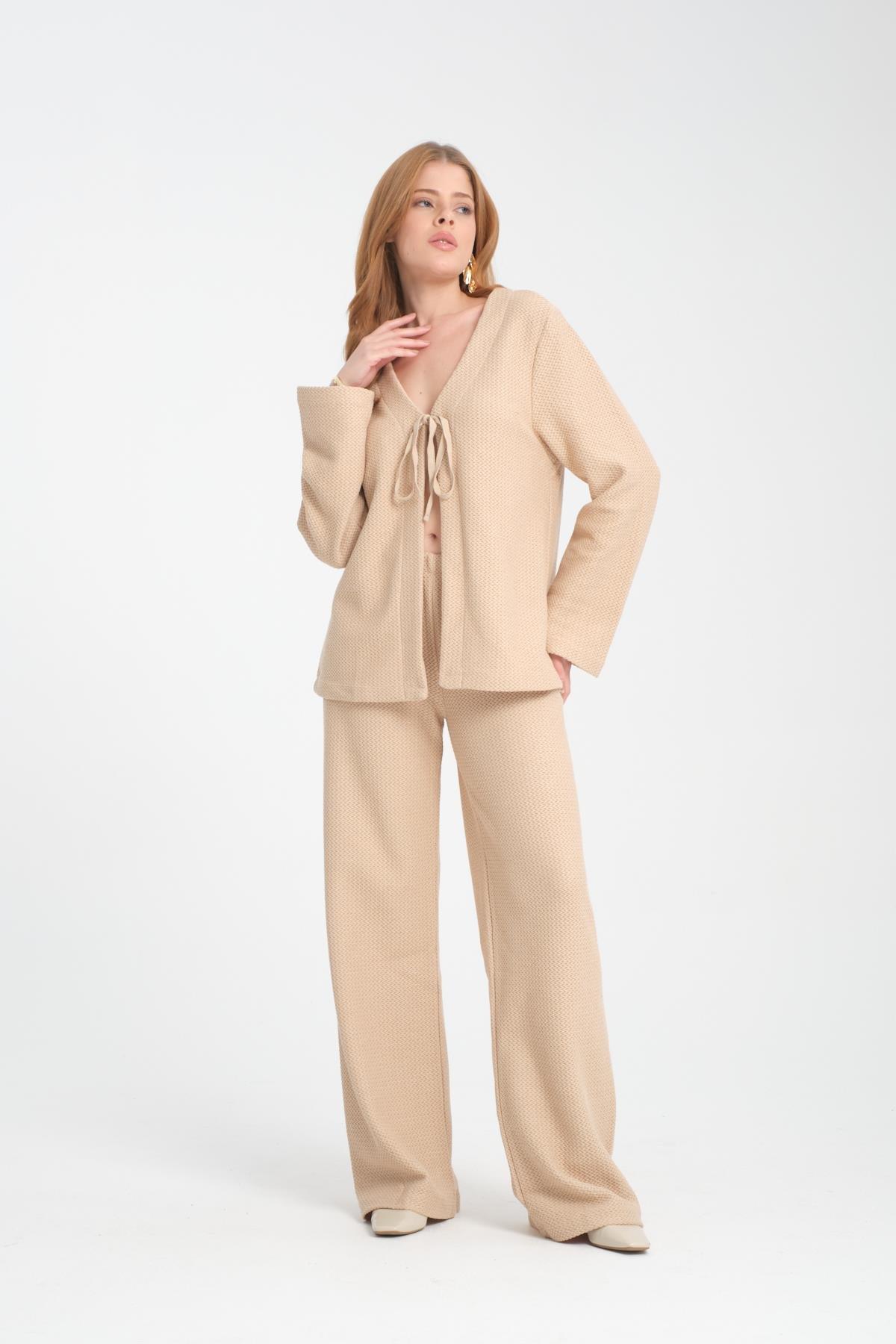 Bu modern kadın takımı, şıklığı ve konforu bir araya getiriyor. V yaka tasarımı, zarif bir görünüm sunarken, geniş paça pantolonlar günlük hayatta rahat hareket etmenizi sağlar. Üstteki bağlama detayı, hem şık bir görünüm hem de kişisel stilinizi yansıtma imkanı sunar.